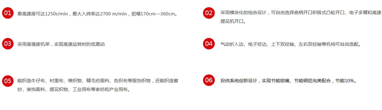 該機(jī)采用模塊組合式設(shè)計(jì)概念,高剛性的機(jī)架,加寬的箱型墻板,獨(dú)特的打緯平衡機(jī)構(gòu),精確的引緯控制技術(shù),造就一款高速、低振動(dòng)、節(jié)能和智能化的新型噴氣織機(jī)。