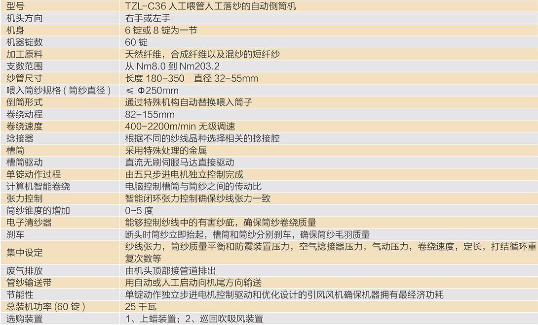 TZL-C36 自動(dòng)倒筒機(jī)是專(zhuān)門(mén)針對(duì)染紗加工企業(yè)所研發(fā)的設(shè)備,對(duì)染紗加工完成后的松式筒紗進(jìn)行緊式倒筒,同時(shí)適合氣流紡紗的成品紗進(jìn)行高精密清紗和分筒加工。
